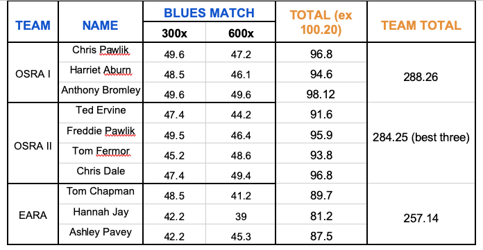 Established as a competition within the club to level the playing field with mixed experienced teams, the Blues Match also welcomed the Exeter Alumni Rifle Association (EARA) in their inaugural outing as a team. OSRA was split into two teams, with Ted Ervine and Chris Pawlik trying out the role of captain. With fairer weather and virtually absent wind, it was all to play for.