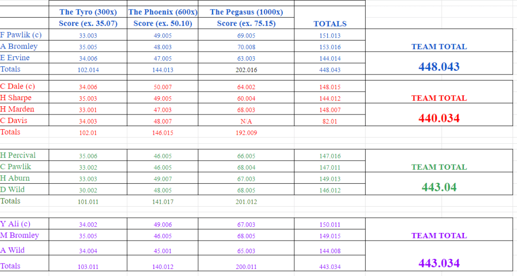 With the first score of the day being Harry Percival’s 35.6 (ex. 35.7), the bar was set high by Team 3’s Captain. Harrison Sharpe, Mike Bromley, and Anthony Bromley all followed with 35s, maintaining the excellent standard. At 600x, the wind was steady for the first detail, allowing Team 1 to drop only 6 points – 144.13/150.30 – but Team 2 stole the day with a 146.15, aided by an excellent HPS of 50.7 by Captain Chris Dale. Harriet Aburn and Harrison Sharpe should both be commended for shooting 49s at 600x, and Harrison should be especially proud of only dropping one point all day. As Dr Ali noted, these are county-level scores.